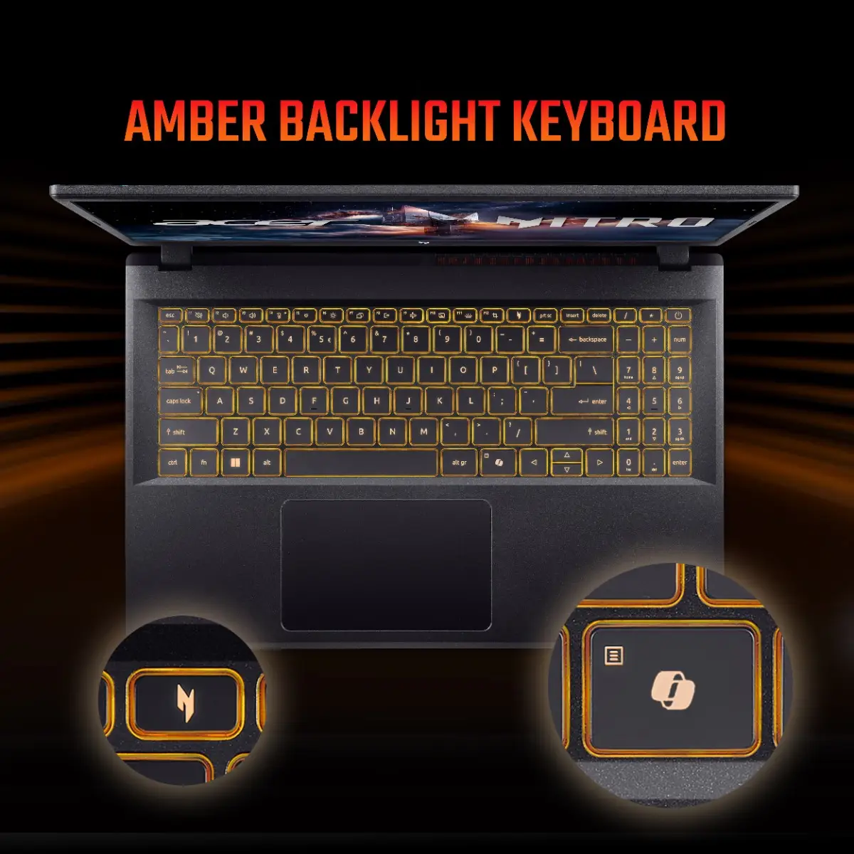 The amber backlit keyboard adds a gaming-focused look while improving visibility and comfort during low-light use.